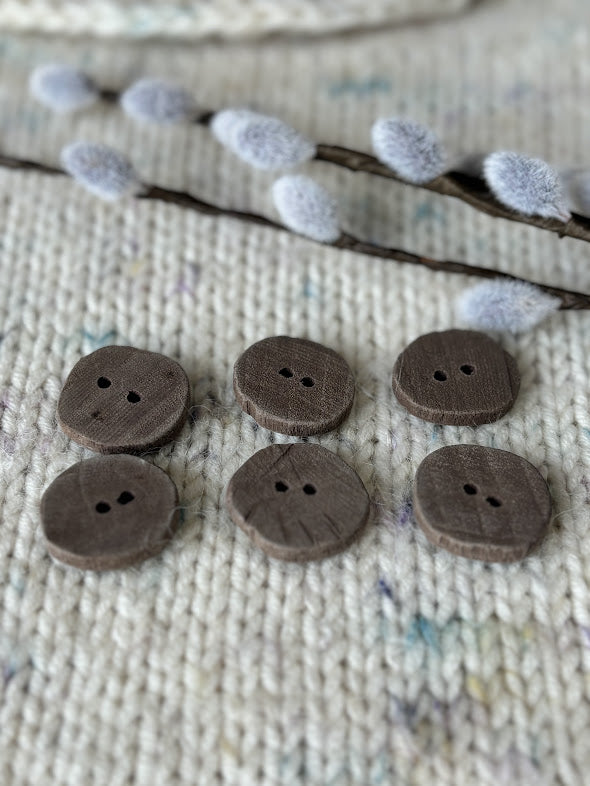 Handmade wood buttons made with Canadian black walnut. Wood sourced from Canadian trees and made in Saskatoon.