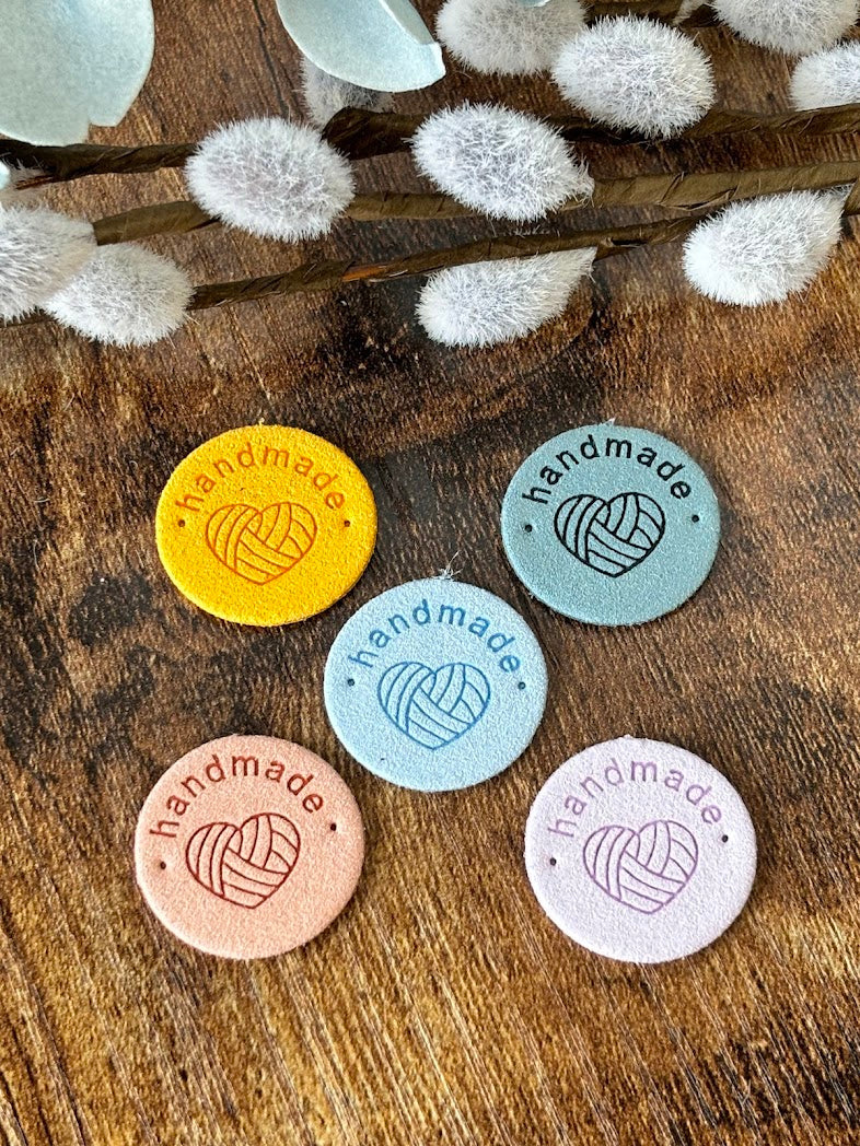 'Handmade' Circle Tag Handmade Exclusive Heart Knitting Crochet Hats Personalized Neutral Pastel Faux Suede Leather Hats Notions Accessories